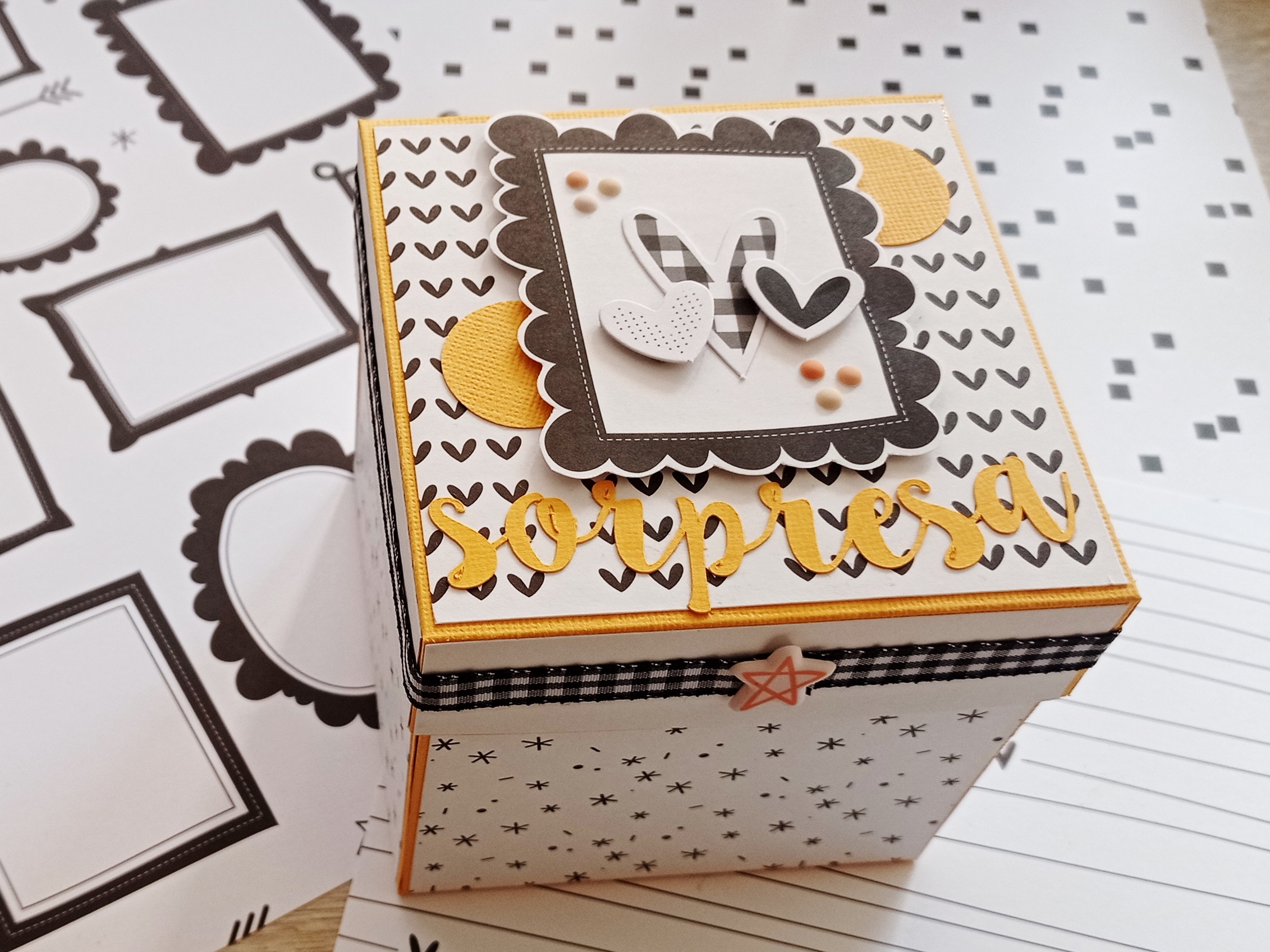 En este tutorial realizamos una caja sorpresa con un mini álbum en el interior que tiene capacidad para un montón de fotos pequeñitas. Puedes verlo mejor aquí.